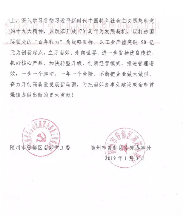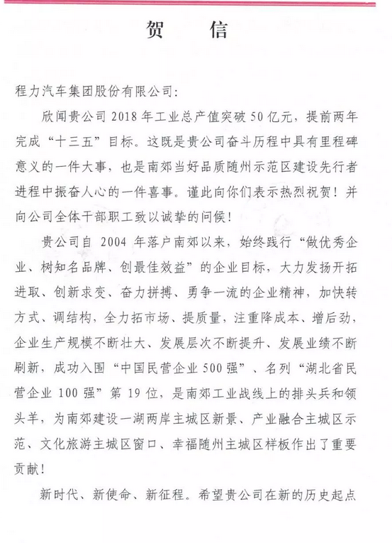 程力汽车集团股份有限公司2018年专汽产值突破50亿,曾都区南郊党工委南郊办事处发贺信鼓励