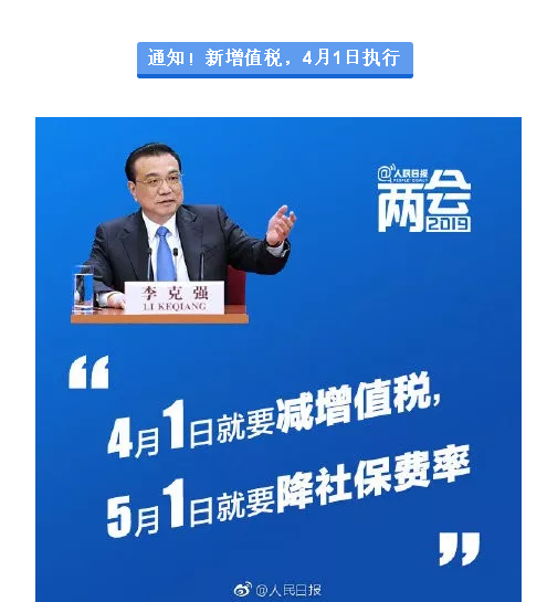 关于增值税新税率执行时间,刚刚总理正式通知!增值税税率16%降13%,10%降9%,6%扩抵。4月1日起正式开始执行!以后开发票要有大变化了。