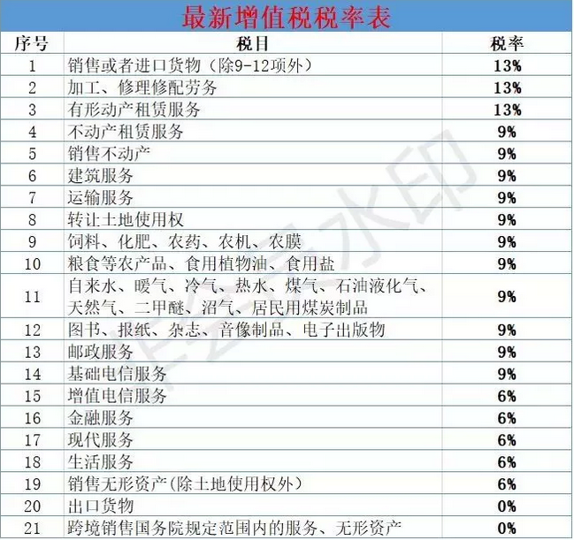 3、 销售方想特意等到税改确定后才开发票,怎么处理? 这要看自己议价能力,我们可以推迟付款,销售方也会考虑资金问题 。 4、增值税税负降了,利润相应增加了,对企业真的有影响吗? 增值税是价外税,不影响利润,影响现金流。 5、税改前签的合同,等到税改后去开票就是按9%吗? 要看合同执行时间,如果是税改之后执行的,且合同当时也是按9%签的合同,可以开9%的发票。 6、想问对于购销双方都有什么影响?建筑的总包合同呢? 对购销双方都有利,对制造业等少付3个点的增值税税额。老项目没有影响,按简易计税,新项目,长期合同,应考虑是补签协议,作为增值税率变更,合同金额减少3个点。 附2019年最新增值税税率表 按改革后的新税率将《增值税税率、征收率、预征率表》进行了调整。 一税率 增值税税率一共有4档:13%,9%,6%,0%。销售交通运输服务、邮政、基础电信、建筑、不动产租赁服务,销售不动产,转让土地使用权以及销售或进口正列举的农产品等货物(易混项见附件1)税率为9%;加工修理修配劳务、有形动产租赁服务和进口税率为13%;销售无形资产(除土地使用权 )为6%,出口货物税率为0;2、其余的:货物是13%,服务是6%。 二征收率 一共有2档,3%和5%,一般是3%,除了财政部和国家税务总局另有规定的。1、5%:主要有销售不动产,不动产租赁,转让土地使用权,提供劳务派遣服务、安全保护服务选择差额纳税的。货物销售里没有5%征收率的。2、征收率绝大多数是3%,容易与5%记混的单独记忆一下:建筑服务,有形动产租赁,小规模纳税人提供劳务派遣服务、安全保护服务未选择差额纳税的。3、两个减按:个人出租住房,按照5%的征收率减按1.5%计算应纳税额。销售自己使用过的固定资产、旧货,按照3%征收率减按2%征收。4、小规模纳税人以及选择简易计税的一般纳税人(见附件2)计算税款时使用征收率。