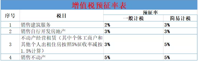 三预征率 预征率有3档,2%,3%和5%。简易计税的预征率基本上与征收率一致。销售不动产和销售自行开发房地产的预征率简易计税与一般计税相同。注意:换算成不含税价时,分母为税率或征收率,而不是预征率。如纳税人出租不动产适用一般计税方法计税的,应预缴税款=含税销售额÷(1+9%)×预征率3%