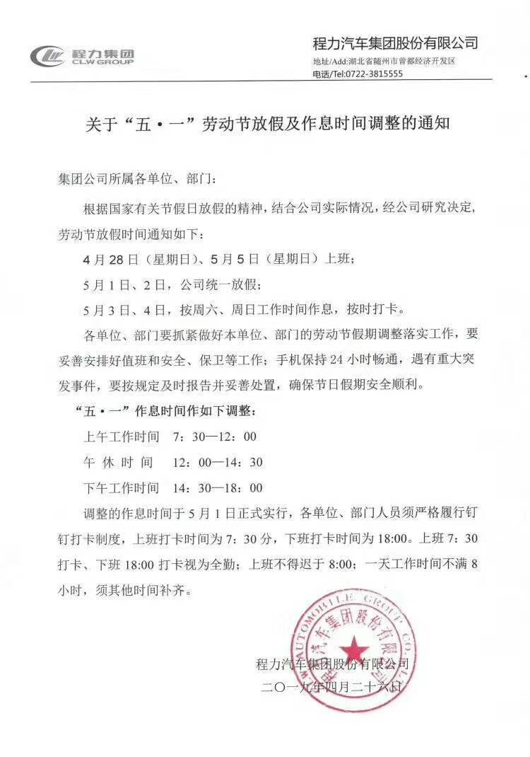 2019湖北程力集团五一放假安排和作息时间调整通知