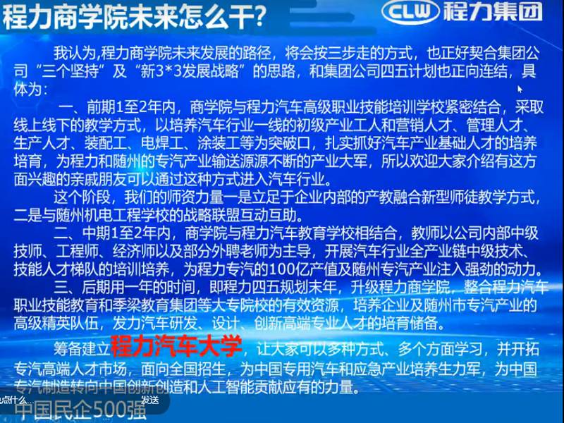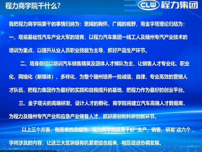 2020年确是一个不同寻常的一年,一场新型冠状病毒感染的肺炎疫情席卷全国,牵动着亿万国人的心。湖北程力作为中国民营500强企业,公司领导多次为随州捐款,捐物。为随州百姓做贡献。在疫情期间程力商学院组织各专业厂技术专家讲师为程力汽车销售经理提供钉钉在线网上产品业务知识培训学习。下面是程力汽车集团公司总经理董事长程阿罗在程力商学院开播致辞网路连线图片: ![]() 总经理在会上阐述: A:什么是程力商学院? 程力汽车集团股份有限公司的主要四大业务矩阵,即:汽车、金融、教育、投资。 这四大产业矩阵中,汽车是涵盖专用汽车、商用车、新能源汽车、客车、汽车零部件,微卡、轻卡、中卡、重卡、皮卡底盘及整车的研发生产与销售,以及应急专用汽车的产业全方位产业建设、配套与生产营销。 金融作为企业发展的血脉,也主要是围绕着以汽车产业进行匹配和支撑;第三个增长极,就是我们的教育矩阵,这也是为程力的汽车产业,乃至为随州作为中国专汽之都的大工业,做汽车产业基础人才培训和高端研发设计、营销人才的孵化提升;当然,作为资本的逐利的本质属性,公司也会对前瞻性、新兴高科技产业和国家鼓励的战略性支柱产业做适当的投资。 明白了这些思路,我们就可以很好的理解什么是程力商学院了。 简单的讲,程力商学院就是以汽车研发生产销售为主要内容,进行学习交流的职业教育平台,它分为线上网络直播课堂学习及线下实体培训学习的两种方式,商学院汇聚了社会各界的专家、教授,智囊、企业家、行业泰斗、营销精英及政商高端人才,是汽车产业发展的知识宝库和动力源泉,商学院从2018年筹建上线,至今已2年 B: 程力商学院干什么? 程力商学院要干的事情归纳为:宽阔的胸怀、广阔的视野,用金字塔理论归结为: 一、塔底基础性汽车产业大军的培育,以程力汽车集团一线工人及随州专汽产业技术的培训为重点,以提升从业人员职业技能为主导,抓好产品生产环节。 二、塔身部位以培训汽车销售精英及团体人才梯队为主,让销售人才专业化、职业化,网络化(新媒体)、多样化,为整个随州培养一批诚信、自律、专业高效的营销人才队伍,把程力集团作为最好的实践和自我提升的基地,把程力作为最好的创业平台。 三、金子塔尖的高端研发、设计人才的孵化,商学院将建立汽车高端人才数据库,为程力及随州专汽产业和应急产业储备人才,抓好原创和科研创新环节。 以上三个方面,我简单的总结为:程力商学院就是干好“生产、销售、研发'这六个字所涉及的内容,让这三大区块链有机紧密结合起来,相互促进协调发展。 C程力商学院未来干什么? ![]() 公司总经理程阿罗对商学院的殷切希望 ![]() 程力商学院网上第一期(疫情期间)培训学习结束语: “沉舟侧畔千帆过,病树前头万木春”,走过黑暗我们必将迎来光明;走过黑暗我们必将更加美好!疫情带给我们暂时的困难,只要我们不忘初心任重道远坚如磐石,我们一定会更加众志成城逆势而上再创佳绩。 大家一定要知道,疫情过后,国家一定会加大投资,未来五年,将是创业者最佳的机会,所以现在大家就要加强学习,为随时迎接经济繁荣、市场扩大做好准备。 程力一定要为有准备者提供最好的创业平台,只要你有梦想、无论你是想带团队做销售还是想带团队成为专业厂做专业产品,程力的三个厂区都能为你带来最好的创业环境,或者自己有厂房想加入程力,程力一定为你提供最好的服务团队,最大的销售市场,最响亮的品牌,一定帮你实现你的梦想,没有什么不可实现,只怕你不去一点点学习,在程力找到自己的定位然后再突破。 同志们,我相信有了程力商学院和大家共同进步,大家的梦想都一定能实现。 程力汽车集团2020年3月8日 |