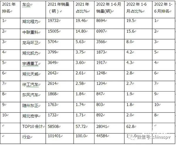 2022年上半年环卫车市场趋势:湖北程力、福建龙马、中联重科居前三,新能源专用汽车表现抢眼。环卫车属于商用车行业中专用车类的一个小众市场,包括各类垃圾车、洒水车、洗扫车、吸污车等。近年来随着经济的发展与人民生活水平的不断提高,特别是近期受疫情的影响,人们对环境卫生质量的要求越来越高,同时随着垃圾分类、城镇化、农村环境整治等利好政策得到有效落地执行,将促进垃圾车、清扫车等环卫车辆需求呈稳定上升趋势,因此环卫车市场已引起业内的关注。但由于受疫情影响,今年上半年环卫车市场也遭遇下滑。 根据终端上牌信息,2022年6月环卫车销量8629辆,环比(今年5月环卫车销量8019辆)增长7.6%,同比(去年6月销量10385辆,见截图1)下降16.9%,2022年1-6月环卫车累计销售44584辆,同比(2021年前6月累计销售54801辆)下降18.6%,累计降幅比1-5月(1-5月累计同比下降19%)缩窄近0.4个百分点。 截图1,2021年各月环卫车销量(数据来源:汽车智库) 按功能用途划分,2022年6月及前6月,环卫车中垃圾车销量均为最多,分别销售3133辆和累计销售16413辆,占据环卫车的市场份额分别为36.3%和36.2%;其次是洒水车;再次是吸污车;第四是洗扫车; 在2022年6月及前6月环卫车销量最大的垃圾车市场中,车厢可卸式垃圾车占比均超半壁江山,领跑垃圾车各细分车型销量; 按燃料种类划分,今年上半年柴油类环卫车仍占主体,但主体地位有减弱趋势;新能源环卫车累计销售2240辆,市场占比超5%,且占比比2021年增加1.32个百分点,领涨环卫车各细分市场,表现抢眼,其中新能源自卸式垃圾车累计销售472辆,领领跑新能源环卫车各细分车型; 从今年上半年环卫车的区域市场流向看,湖北、山东、广东居前三; 从今年上半年企业具体表现看,湖北程力、长沙中联重科、福建龙马环卫车居前三。 下面对今年上半年环卫车市场特点进行解读。 特点一:按功能用途划分,各类垃圾车销量占比超三之一,居榜首 表1,2022年6月及1-6月各类环卫车销量同比、占比及占比同比增减(数据来源:汽车智库及终端上牌信息) 2022年上半年环卫车市场趋势:湖北程力、福建龙马、中联重科居前三,新能源专用汽车表现抢眼。 ---各类环卫车单月和累计分别销售3133辆和16143辆,占比分别为36.3%和36.2%,均超环卫车整体市场的三分之一份额,均居第一,说明垃圾车是环卫车中需求最多的细分车型; ---洒水车单月和累计分别销售2261辆和11742辆,占比分别是26.2%和26.3%,均居第二; ---吸污车单月和累计分别销售1950辆和10161辆,占比分别为22.6%和22.8%,居第三; ---清扫车单月和累计销量分别为1285辆和6538辆,占比分别为14.89%和14.67%,居第四,是环卫车中占比相对较小的细分车型。 总之,无论是今年6月还是今年上半年,垃圾车占比均超三分之一,成为环卫车中占比最高、最受市场青睐的细分车型。 特点二:车厢可卸式垃圾车占比超半壁江山,领跑垃圾车市场 表2,根据终端上牌信息,2022年6月及前6月各类垃圾车销量、占比统计: 上表可见,2022年6月及1-6月各类垃圾车销量及占比呈现以下特点: ---车厢可自卸式垃圾车单月及累计销量分别为1660辆和8158辆,占比分别为50.1%和50.5%,占比均超半壁江山,均居第一,领跑各类垃圾车市场,说明车厢可卸式垃圾车最受垃圾车市场欢迎; ---压缩式垃圾车单月和累计销量分别为1098辆和5688辆,占比分别为35.1%和35.2%,均居第二; ---密封式垃圾车和拉臂式垃圾车无论是单月和累计销量占比均很小; ---其他垃圾车单月和累计销量分别为395辆和2005辆,主要包括各种仓厨垃圾车、挂桶式垃圾车等,占比分别为12.6%和12.5%。 特点三:新能源环卫车占比增加最多,表现抢眼 截图2,2019年—2021年各类动力环卫车销量占比(来源:汽车智库平台) 表3,根据终端上牌及汽车智库平台数据,按动力燃料种类划分,2022年上半年各类环卫车销量及占比统计: 上图表可见,按动力中了划分,在今年上半年的环卫车销量结构中: ---柴油类环卫车累计销售38342辆,占比86%,仍然占据绝对的霸主地位,但占比与2021年比减少1.4个百分点,与2020年、2019年比减少更多,可见近年来柴油动力环卫车占比有逐年减少的趋势; ---汽油动力环卫车占比7%,居第二,且与近年比有微弱增长的迹象; ---新能源环卫车(几乎都是纯电动类)累计销售2240辆,占比5.02%,与2021年比占比增加1.32个百分点,是占比增加最多的细分车型,与2020年和2019年比增加更多,说明目前新能源环卫车增长的势头最为强劲。这主要得益于国家双碳战略的持续发力。 表4,另外根据终端上牌信息,2022年上半年新能源环卫车最畅销的top5车型: 上表可见,在今年上半年新能源环卫车销量TOP5车型中,新能源自卸式垃圾车销量占比21.1%,居第一,其次是新能源洗扫车,占比20%;再次是新能源清洗车,占比19.3%;top5累计占比82.8%,占据了新能源环卫车市场的垄断地位。 总之,在今年上半年各类动力的环卫车市场份额变化中,新能源增加最多,表现亮眼。 特点四:湖北、山东、广东居前三;TOP10市场集中度提高 表5,根据终端上牌信息,2022年1-6月环卫车流向区域市场top10统计: 上表可见,在2022年1-6月环卫车销量区域分布中,TOP10区域呈现以下特点: ---湖北销量6776辆,占比15.2%,居第一,且与2021年比占比增加3.07个百分点,强者更强,表现突出; ---山东销量3834辆,占比8.6%,位居第二,且占比与2021年比增加0.1个部分; ---广东销量3478辆,占比7.8%,位居第三,但占比与2021年下降1.7个百分点; ---
