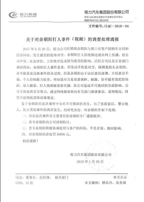 2018年1月29日,湖北程力汽车集团股份有限公司对2017年6月20日,关于对余朝阳打人事件(视频)的调查处理做出了通报。  ![]() 我们来看看,相关事件目前在网上流传的视频截图  ![]() 再看看,关于事件被某搜索引擎收录的条数  ![]() 遇到纠纷,请双方多协调解决且勿动手,同时希望此事件平息下去!请勿造谣并传播。共建中国专汽之都—随州荣誉称号 |