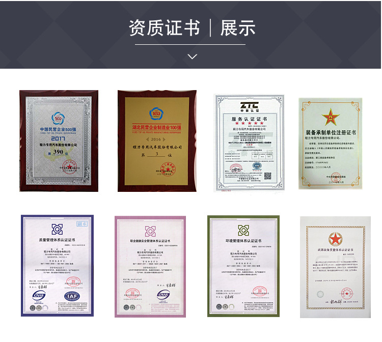 多样│满足各种专汽需求 专用车产业细分产品众多,每个产品的市场格局由于行业门槛和市场特征的不同具有较大差异。随着高等级公路的建设、物流市场的逐渐成熟,以及国内大量基础设施建设,专用汽车产品结构较过去有了很大变化,重型车和轻型车比例处于增长趋势,中型车比例继续下降;体现专用功能特性的产品比重加大;种数得到大幅增加,产品结构更加合理。 程力主要产品包括洒水车、加油车、冷藏车、油罐车、垃圾车、吸污车、道路清扫车、高压清洗车、高空作业车等八大系列100多个品种车型及其相关专用汽车配件,技术力量雄厚、检测手段完备,拥有大型设备750台(套)及16条总装生产线。 产品质量稳定,经营方式灵活,公司现已全面通过ISO9001-2008 国际质量体系认证、3C国际强制产品认证,并通过出口产品的各项认证。“程力威”产品有680多个品种上国家公告目录,其中有不少的车型如洒水车、垃圾车、吸污车、吸粪车等环卫系列车型享受国家免车辆购置税优惠条件。