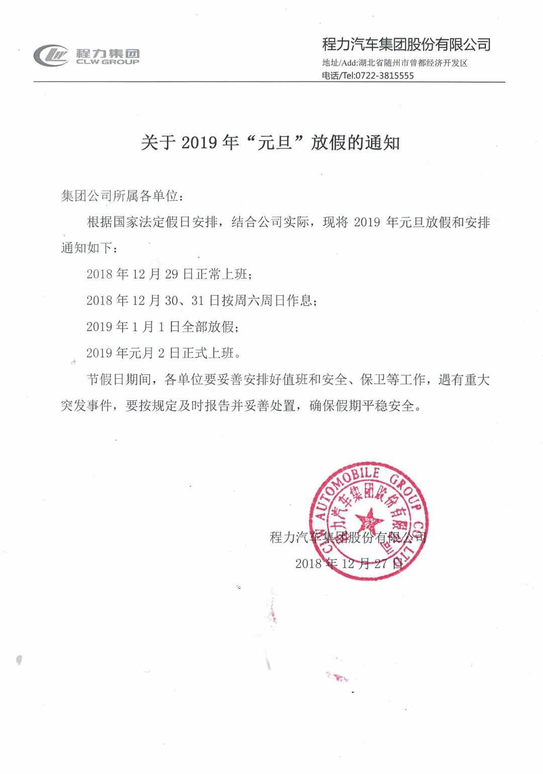 | 湖北程力汽车集团2019年元旦放假通知: |