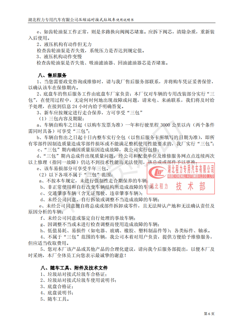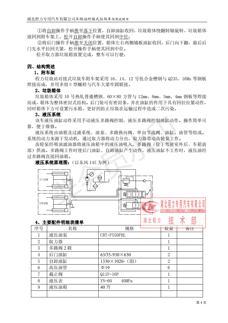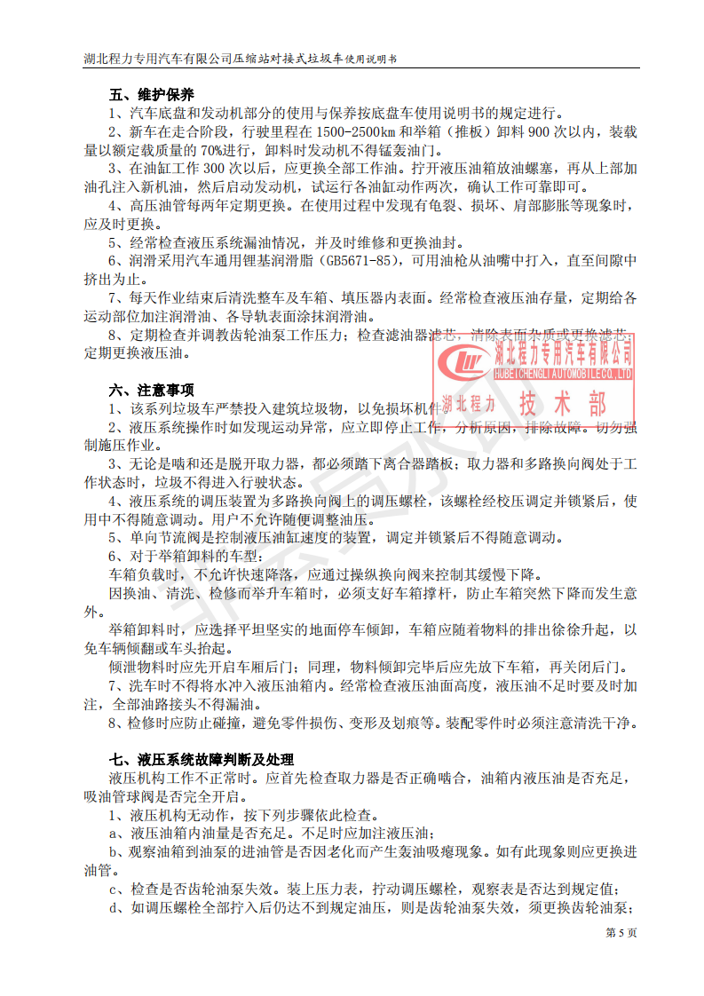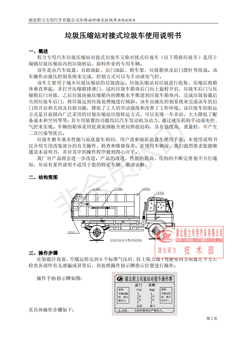 湖北程力垃圾压缩站对接式垃圾车使用操作说明书