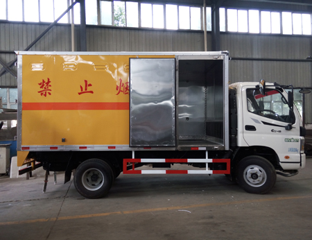 专用功能说明: 1、爆破器材运输车底盘的型号可分为:东风、江铃、江淮、奥铃、时代、欧曼、庆铃、解放等。驱动形式可分为:双驱动和四驱动,按额定载质量有0.5吨—9.9吨(国防科工委要求最大上户吨位不超过10吨)。 2、厢体分为两部分:A:运输炸药;B:运输雷管(抗暴容器);C:炸药,雷管同时运输(厢体必须隔仓,分仓运输,加装抗爆容器)。厢体为双层金属骨架结构,外部为冷扎钢板,内壁采用铝合金板蒙面,夹层为隔热阻燃材料填充。设置对开门,如需安装抗暴容器则增开侧门,侧壁设有防雨功能自然通风窗口,以使厢内外空气流动,厢体内部做防静电处理,厢体底部与厢内前部铺有阻燃导静电胶板,并与底盘等电位连接,通过车辆后端的导静电装置与大地相连,可防止静电火花的产生和车辆静电及时释放,提高爆破器材运输车的安全性。厢体内部前面和侧面装有固定拉环,与捆绑带使用捆绑货物以避免移动,保证安全。 3、 感烟报警器:是感测车厢内火情的专用装置,安装在车厢内顶部,并与驾驶室内报警装置连接,当有火情烟雾出现,在驾驶室进行蜂鸣报警通知驾驶员,保证及时消除险情。 4、防盗报警器:为了保证安全,在车厢后方和侧面开设有门,在各门器框上方安装有门磁开关报警器(根据用户要求选装防盗监视器。行车记录仪等)当厢门被打开时,驾驶室内的蜂鸣器发出报警声音,不使用时可将驾驶室内的控制开关关闭。可保证在行驶过程中,整车始终处于受控状态。 5、整车发动机排气装置采用前置式,并安装有排气火花熄灭器(防火罩),防止热源对爆炸物产生不良影响。 6、底盘上装有两条拖地导静电胶带,厢体外侧安装示廓标记灯以及手提灭火器等安全装置。 7、车身颜色为黄色,并有“严禁烟火”和“爆”字样,贴有反光标识。 目前炸药运输车,雷管运输车,防爆车,以及烟花爆竹运输车都归为爆破器材运输车,这并且类车辆都具有厢体强度高、防火阻燃、防雨、防止静电火花、烟火报警和防盗报警等主要功能,现在的爆破器材运输车已经脱离原来的平板运输,而改为厢式运输 ,所以本次介绍的爆破器材运输车都为厢式运输。 排气火花熄灭器