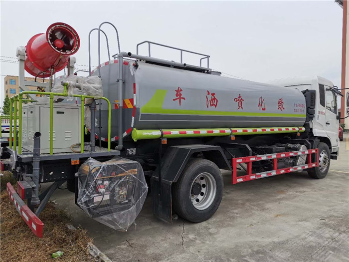 东风天锦12吨30米雾炮车亮点: 底盘配置:采用原装东风天锦底盘,轴距4700或者5000,国六康明斯210马力发动机,东风6档变速箱,900R20钢丝胎带备胎,气刹,断气刹,方向助力,离合助力,原装空调,电动玻璃,中控锁,东风原厂4通道ABS。改装配置:采用4mm国标碳钢板纵缝焊接一次卷制成型,罐内设防浪隔板防止水浪冲击,有效容积12-14立方可选,配60/90大功率洒水泵,管道采用大口径无缝钢管+大口径球阀,标配14米前冲,后洒侧喷功能,35米平台水炮,后平台加装30米雾炮机及8.5KW柴油专用副发电机。 雾炮机参数:射程30米,风机电机3KW,水泵电机3KW,喷雾流量20L/min,工作压力1.5-3.5MPa,雾粒度50-150微米,360°水平旋转,-10~45°上下俯仰角度,手动+遥控控制,雾炮机尺寸:1300*700*1600mm 湖北程力国六东风天锦12方-14方绿化喷洒车|雾炮抑尘车|洒水车程力威牌CLW5161GPS6WL型绿化喷洒车CLW5180GPSE6型绿化喷洒车图片价格: