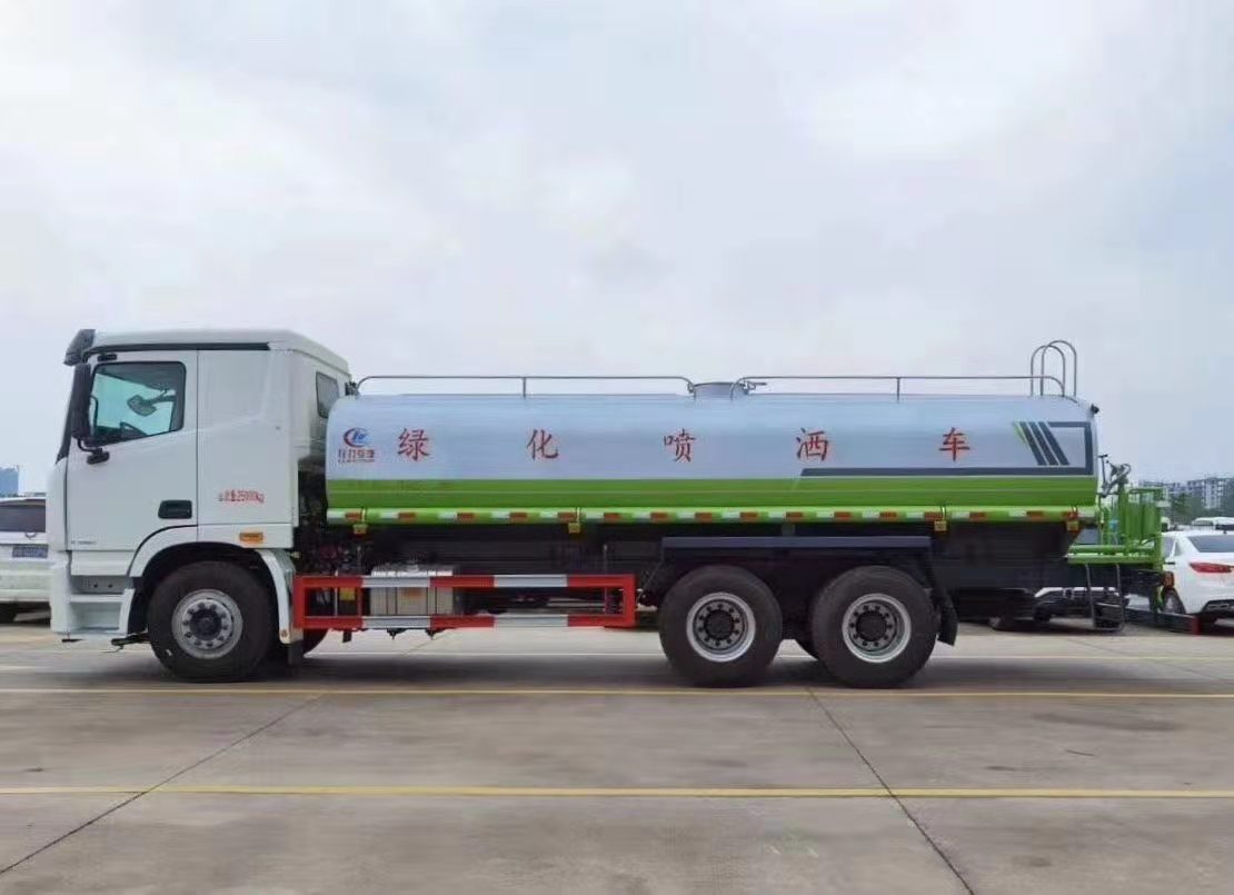湖北程力国六福田欧曼GTL后双桥洒水车选装配置: 1、可选装气动球阀开关驾驶室内控制; 2、可选装罐体尾部带LED箭头指示灯; 前冲(喷)、后洒、带侧喷(花洒)、带后工作平台、平台上安装绿化洒水高炮(炮喷射形状可调节:直冲、大雨、中雨、毛毛雨、雾状、可连续调节,360°旋转),配消防接口,自流阀,滤网,带自吸自排功能。 湖北程力国六福田欧曼GTL后双桥洒水车是一款采用国六排放标准福田欧曼GTL后双桥原装底盘改装的环卫洒水车,该车配置豪华,驾乘舒适,该车罐体容积:18-20立方米,标配前冲、后洒、侧喷、后平台高炮,是园林绿化、小区物业、公路养护的常用车型。 湖北程力国六欧曼后双桥18-20方绿化喷洒车(洒水车)程力威牌CLW5250GPSBDP型绿化喷洒车图片价格: