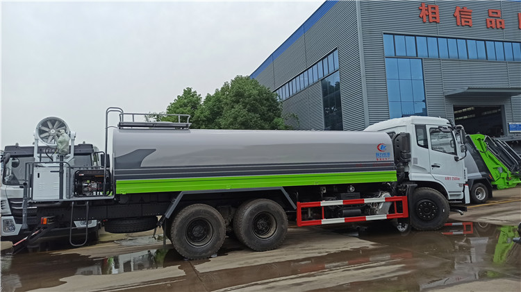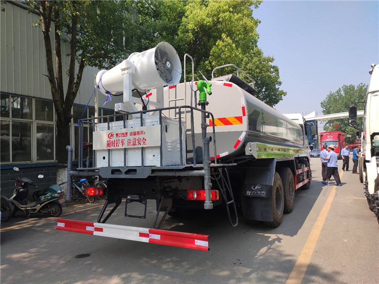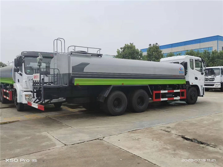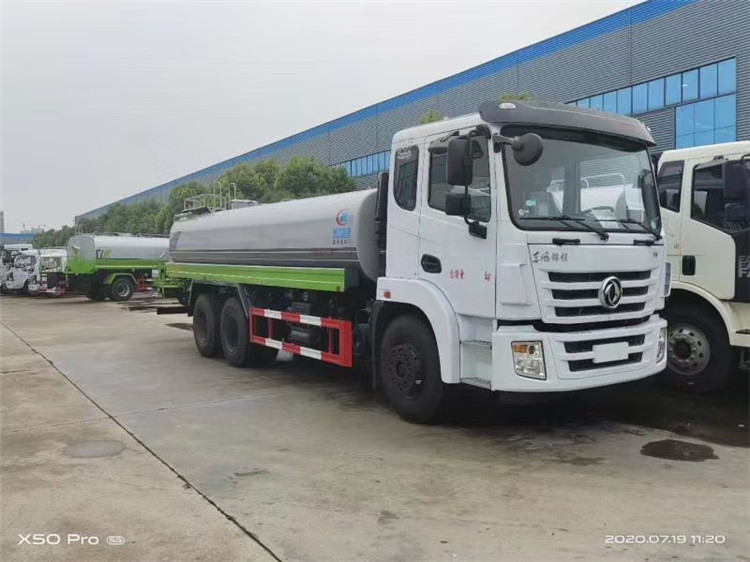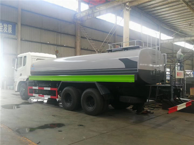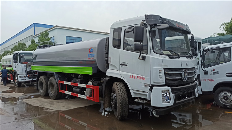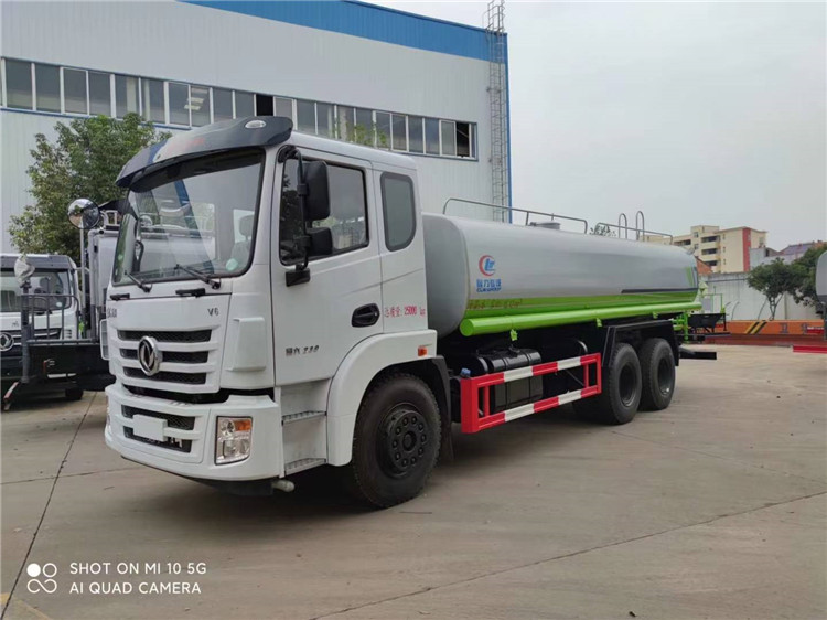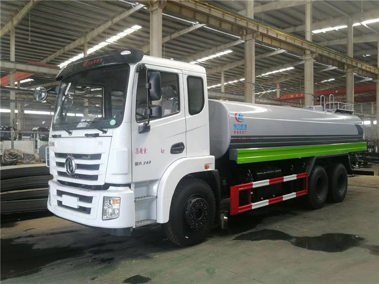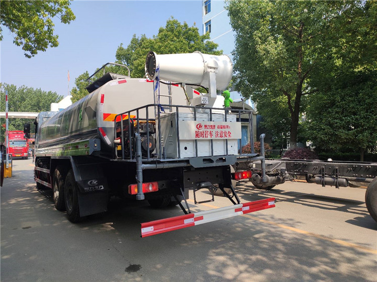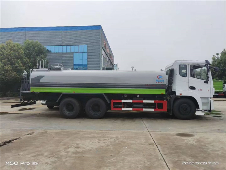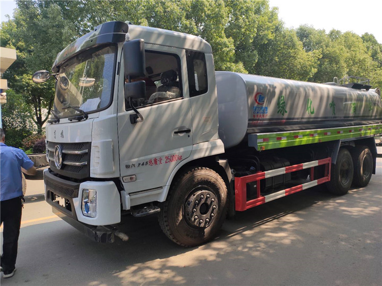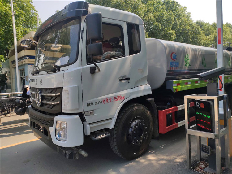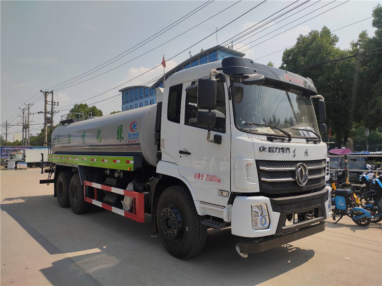 湖北程力国六东风锦程V6后双桥18吨洒水车程力威牌CLW5253GPSD6型绿化喷洒车厂家配置: | 湖北程力国六东风锦程V6后双桥18吨洒水车底盘配置:采用东风后双桥原装底盘,东风锦程齐星军工V6四点悬浮驾驶室,4350+1350mm轴距,搭载国六(国Ⅵ)东风康明斯230/260马力柴油发动机,功率169/191kw,国六排放,陕齿法士特八档变速箱,11.00R20钢丝胎,前桥5T,后桥双10T,方向助力,断气刹,排气制动,原装空调,行驶记录仪,多媒体显示屏,电动门窗,中控锁,气囊座椅,ABS。湖北程力国六东风锦程V6后双桥18吨洒水车专用配置:罐体容积:19立方米,罐体钢板为4mm碳钢Q235材质专用容积板一次成型,罐内隔板具有防波作用,以减轻汽车行驶时罐体液体冲击;配大功率专用洒水泵,泵可自吸自排;整车前冲、后洒、侧喷、后平台带绿化洒水炮,洒水炮可全方位旋转,可连续调成直冲状、大雨、小雨、毛毛雨;前封头带水位计,后平台主管路带1寸浇花接口,后爬梯,带1个消防接头,带1个自流阀,1个过滤装置。湖北程力国六东风锦程V6后双桥18吨洒水车选装配置:1、可选装气动球阀开关驾驶室内控制; 2、可选装后平台带CLW-30、40型雾炮机组